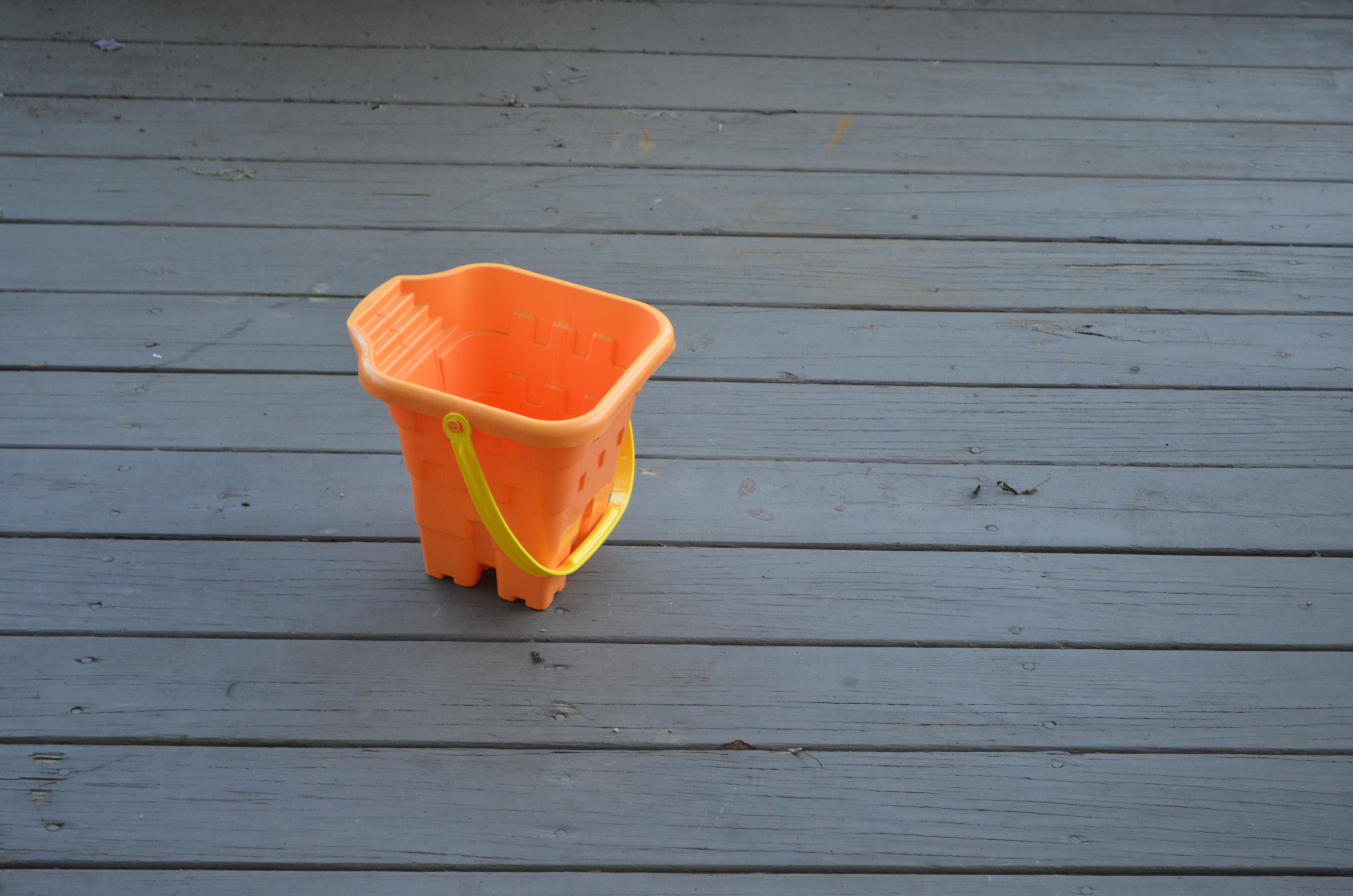 Now the S-N-A-K-E is half under the orange bucket, and half under the baseboard , so I wedge the shovel between the two and try to hold it there while she tries to get it in the bucket.