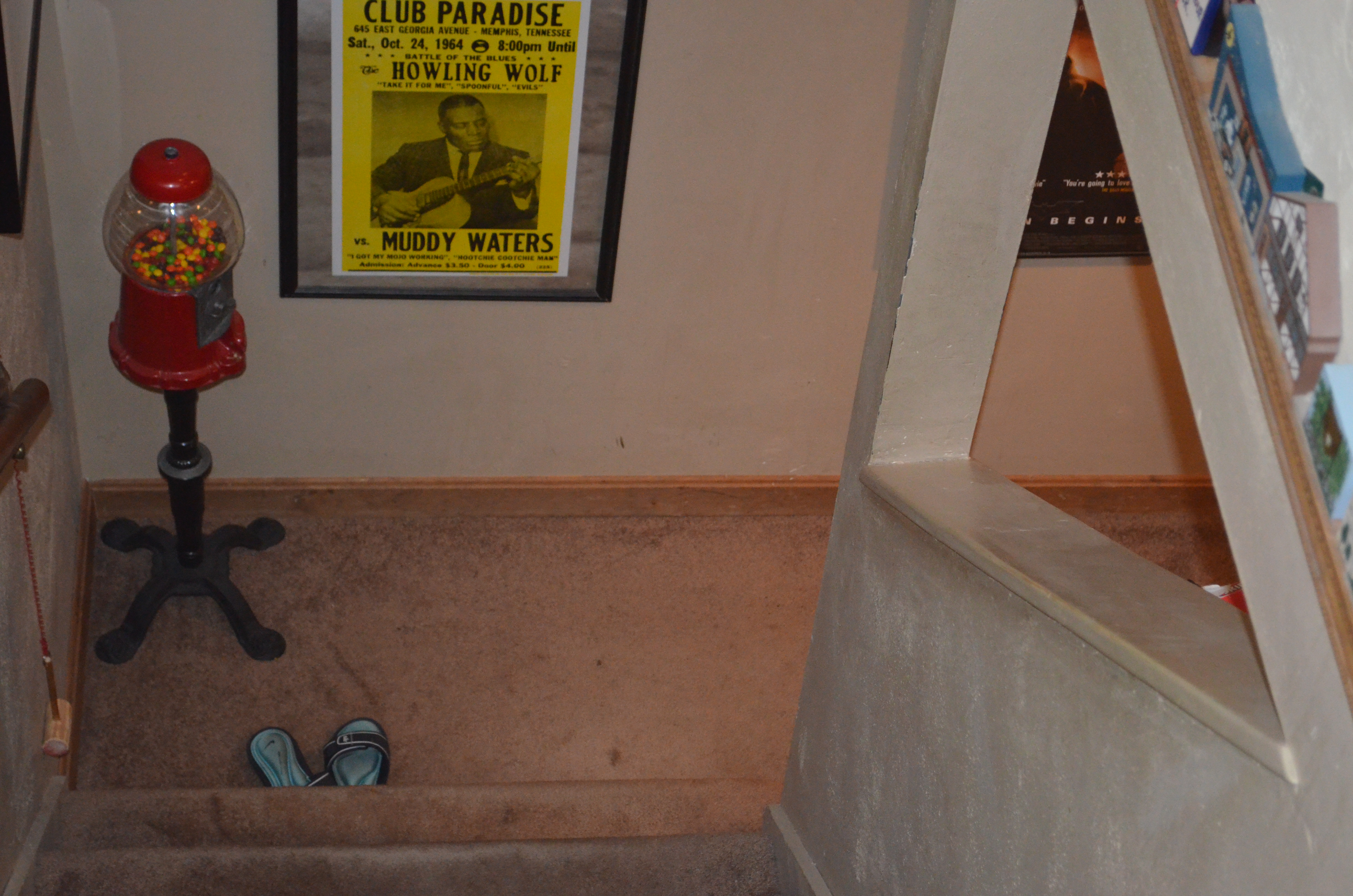 Anyway , the plan is to get it in the bucket. We bring the dogs down with us in case it has fled and we need to find it, and she with her bucket goes to the right, and I with my stick go left. The useless dogs can not figure out what the heck we want them to do, and are whining because they know they are not allowed in the basement, so we let them go back upstairs. I decide I am going to block the stairs while she looks under the nearest chair , and as I go to move Faith’s flip flops out of the way, discover in a very screaming sort of way that under the flip flops is where it was hiding.