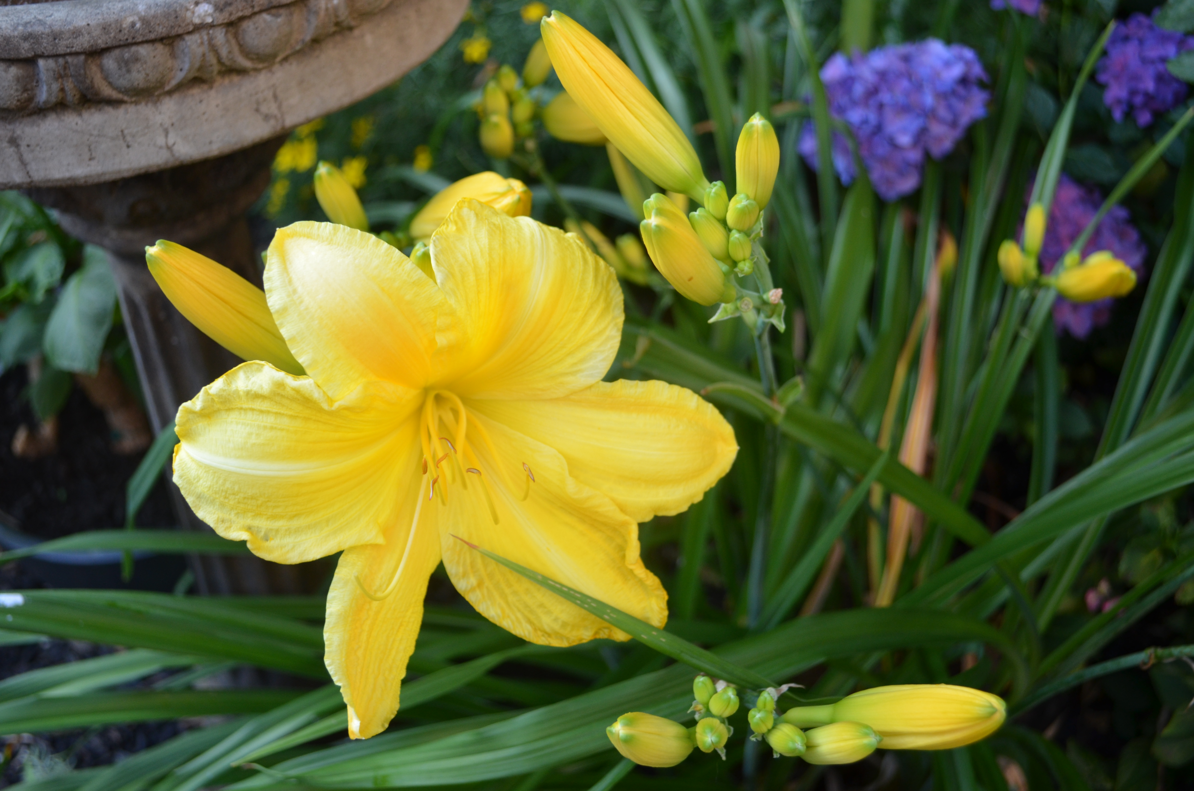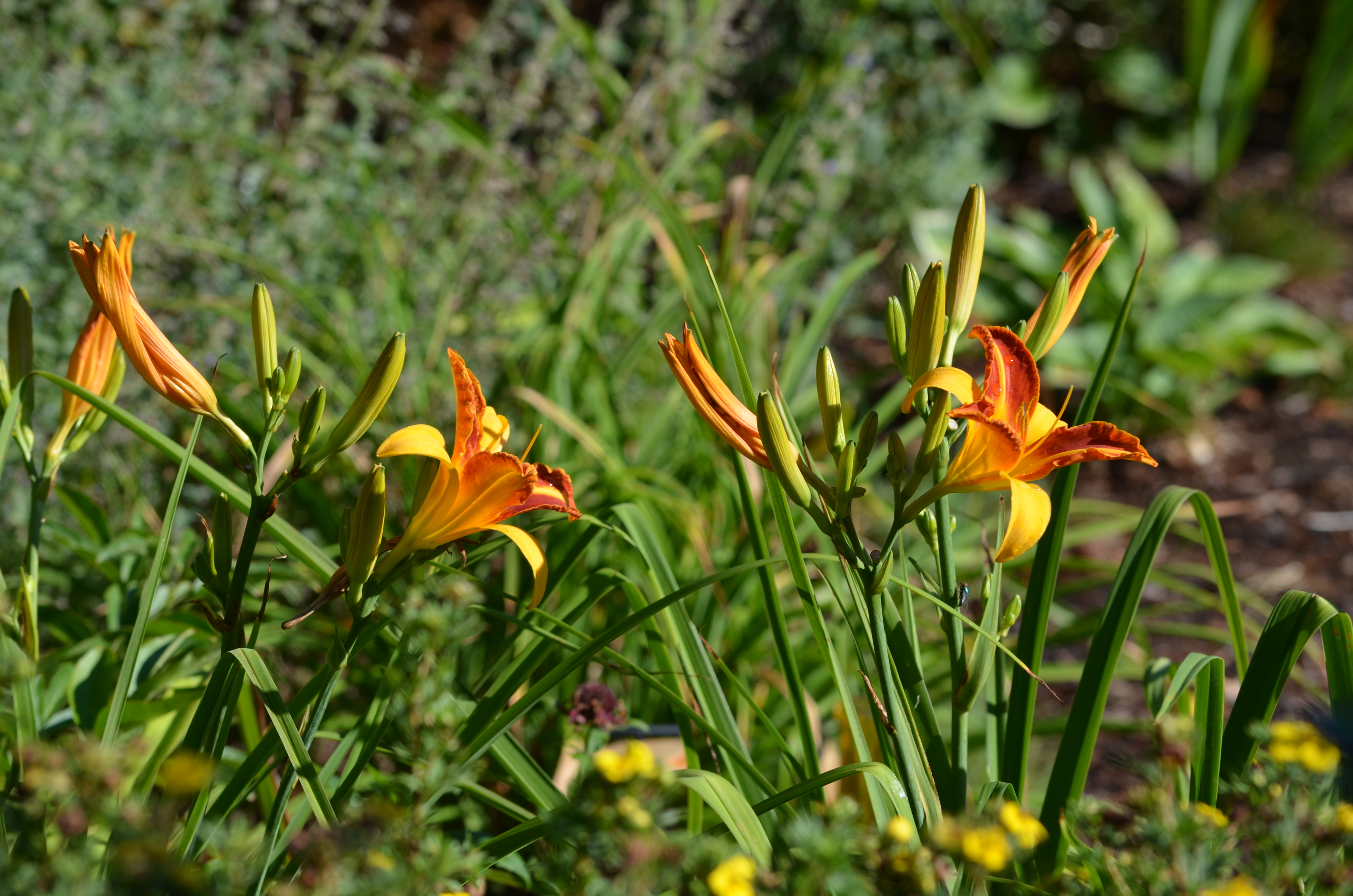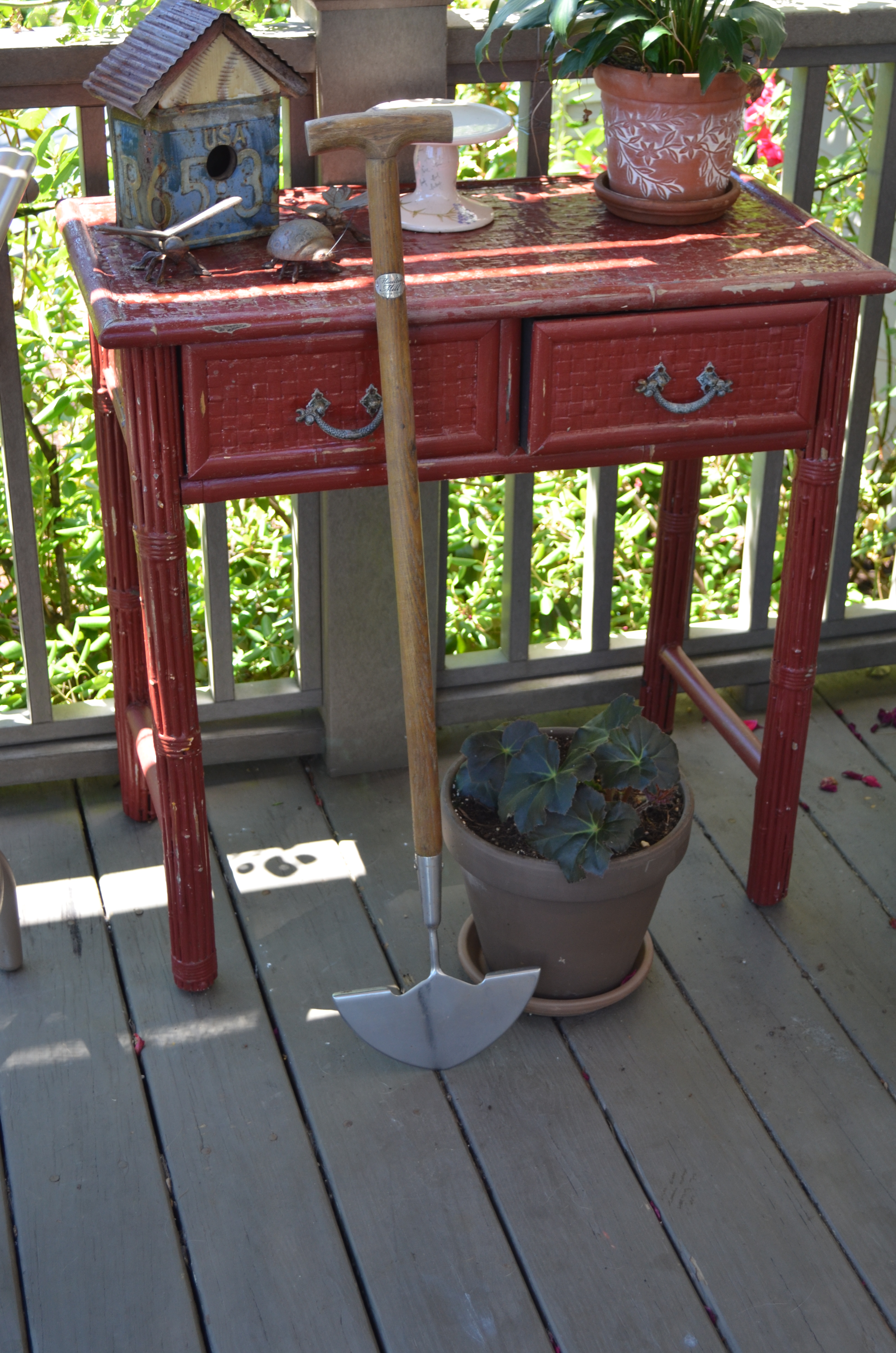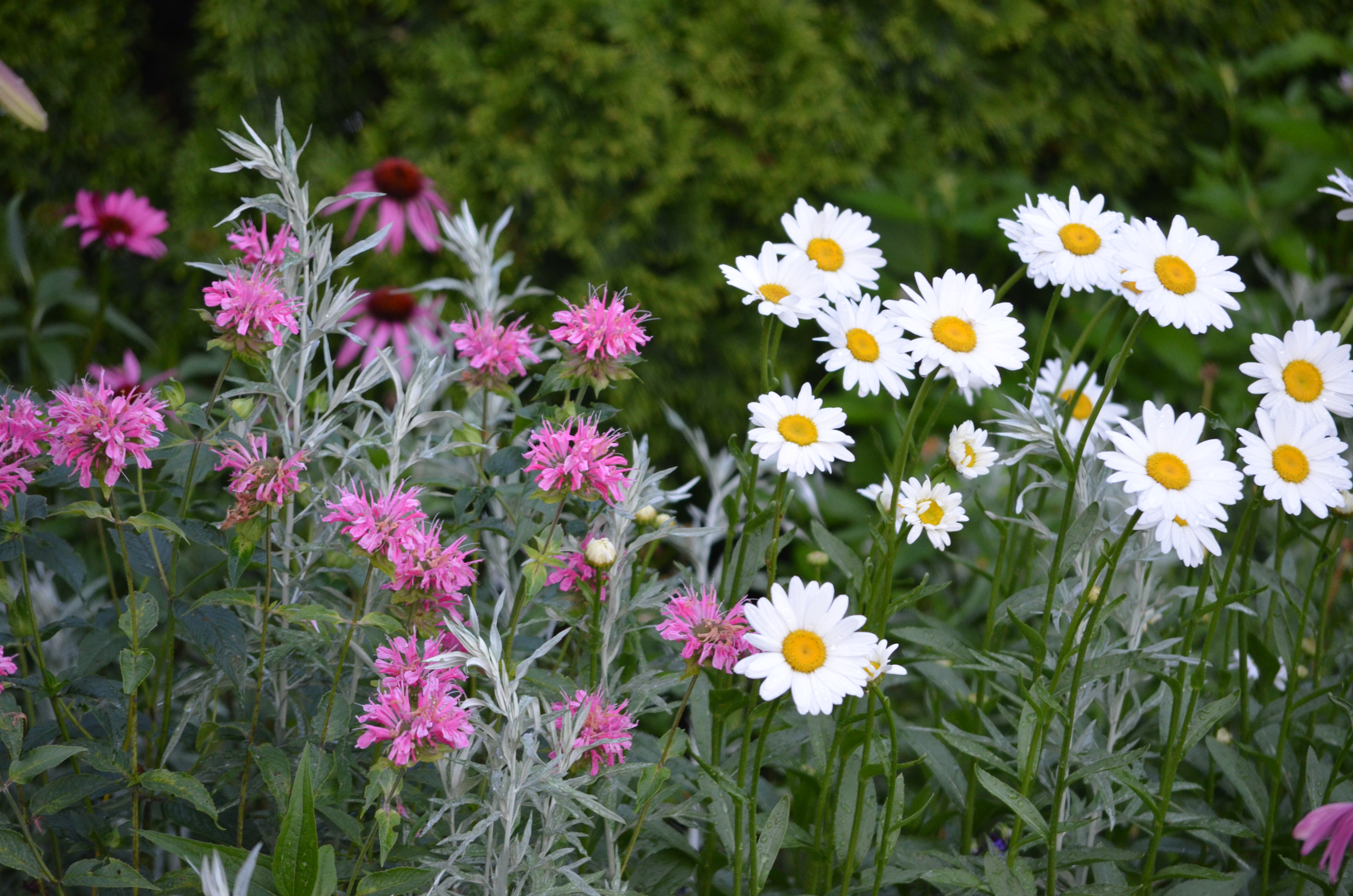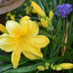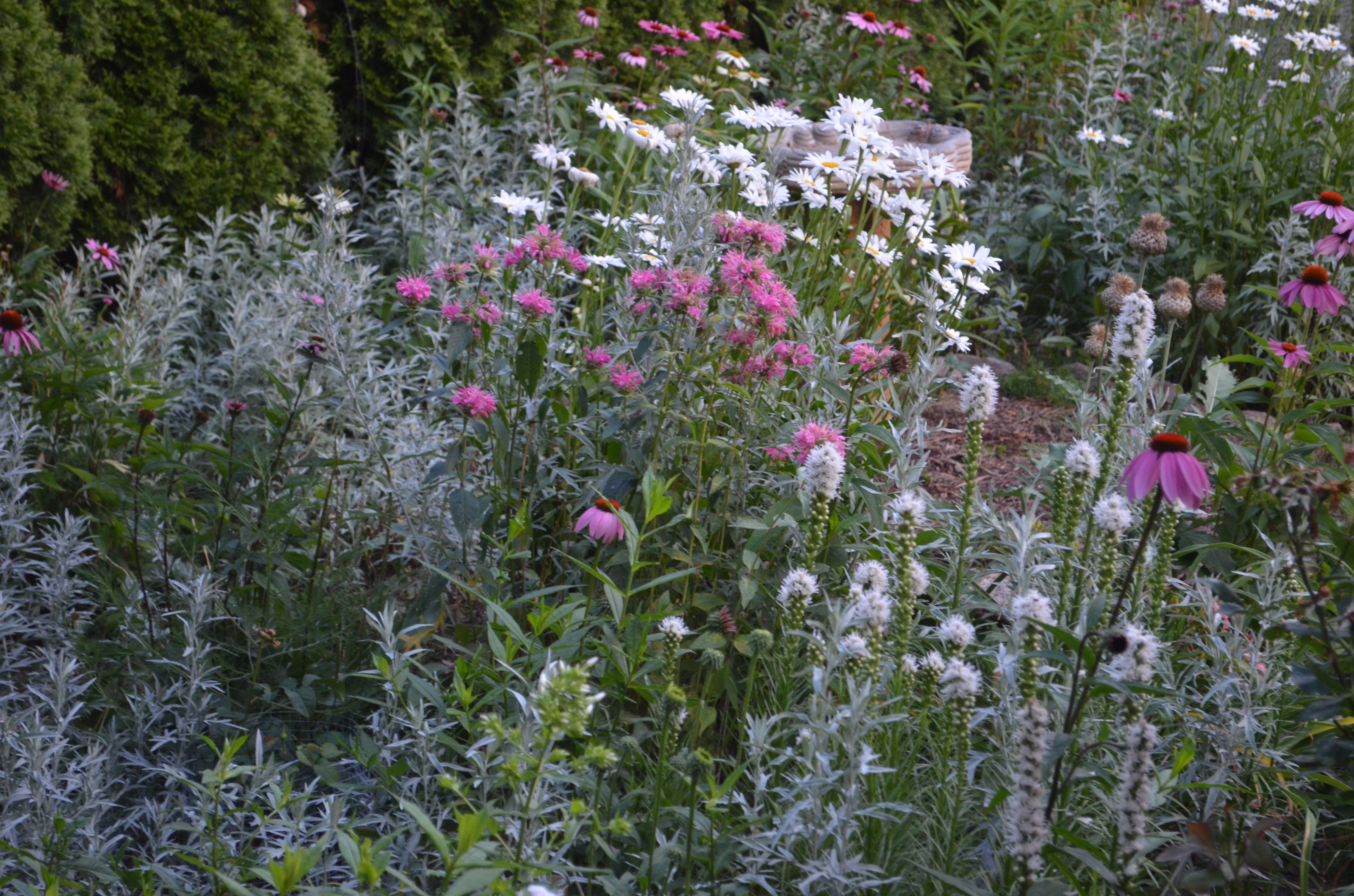 Just to add to the feeling of despair, the wasps are out in full force. In this full-of-flowers garden the pollinators outnumber the humans about a billion to 1 and we all seem to live in harmony until the wasps move in. They are building nests in the patio furniture, behind the downspouts, in the empty birdhouses. The ground dwellers and diggers ( great black wasps and golden diggger wasps) have dug large holes in the entire front bed and walkway, and there is hardly a place I can walk by without being warned by the sentries of the ground hornets to back off. July always brings the first of what will be many stings, but this year the first sting resulted in an unfortunate reaction that leaves me now needing an epi-pen so the next sting will not be my last. I have always let the wasps that were generally out of the way of traffic do as they please, especially the diggers because they feed the grasshoppers ( yet another plague) to their young. But this year their numbers are very large and now I am allergic so I need to erradicate nests that are too close for comfort and I am not happy about it.