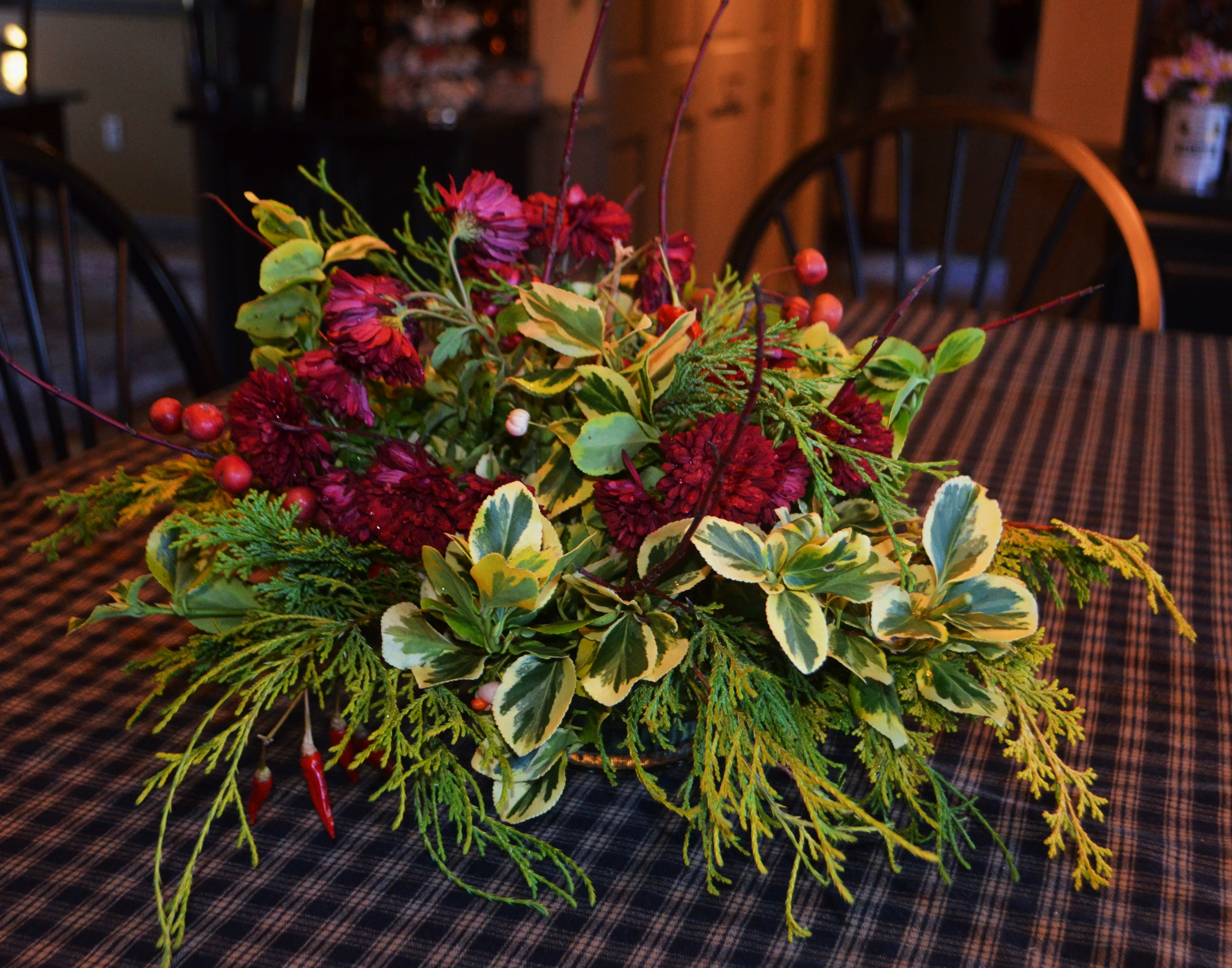 The second one is done in traditional centerpiece format, and has foliage from Euonymous fortuneii ‘Gold Splash’, greens from several different chamaecyparis ,more red twig dogwood, crab apples, little red peppers ( from the japanese four color pepper) and again the only flowers are a Chrysanthemum , this one called ‘Red Mammoth’.