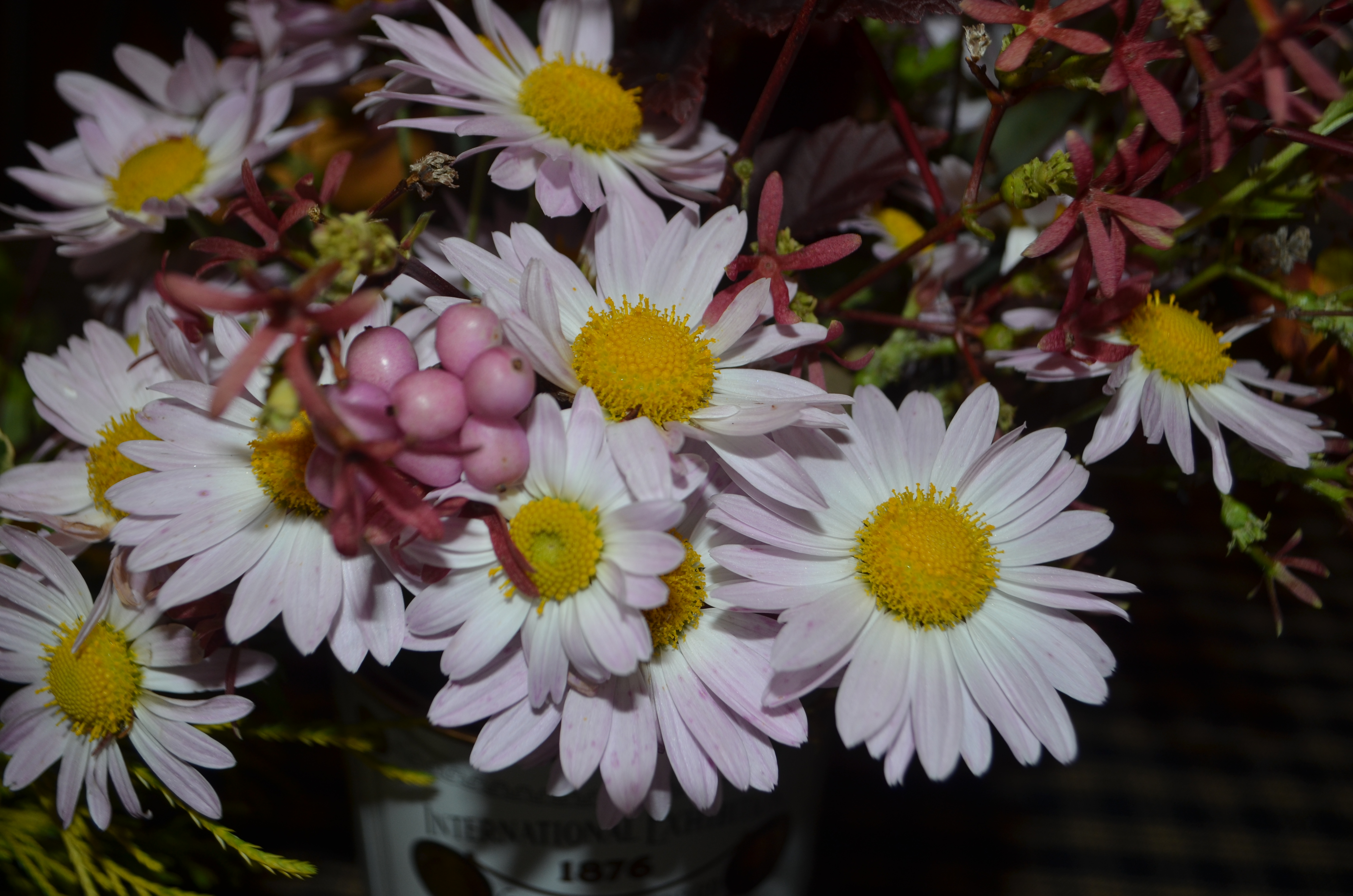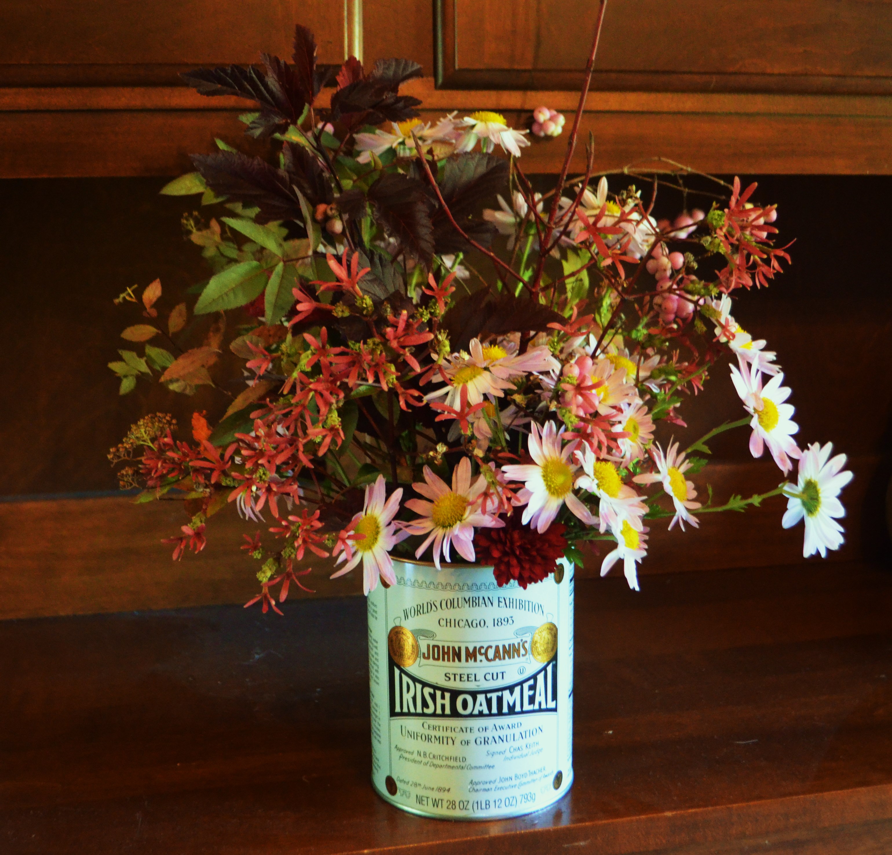 This first one is a sweet little side table decoration composed of the reddish bracts from a Heptacodium minconoides tree, red dogwood stems from Cornus alba (dogwood) ‘Ivory Halo’, the delightful pink berries of symphoricarpos (coral berry) ‘Amethyst”, foliage from a spirea called ‘Firemound”, rosa glauca and physocarpus opulifolius(ninebark) ‘Coppertina’ and the only flowers are those of a Chrysanthemum called Sheffield Pink.