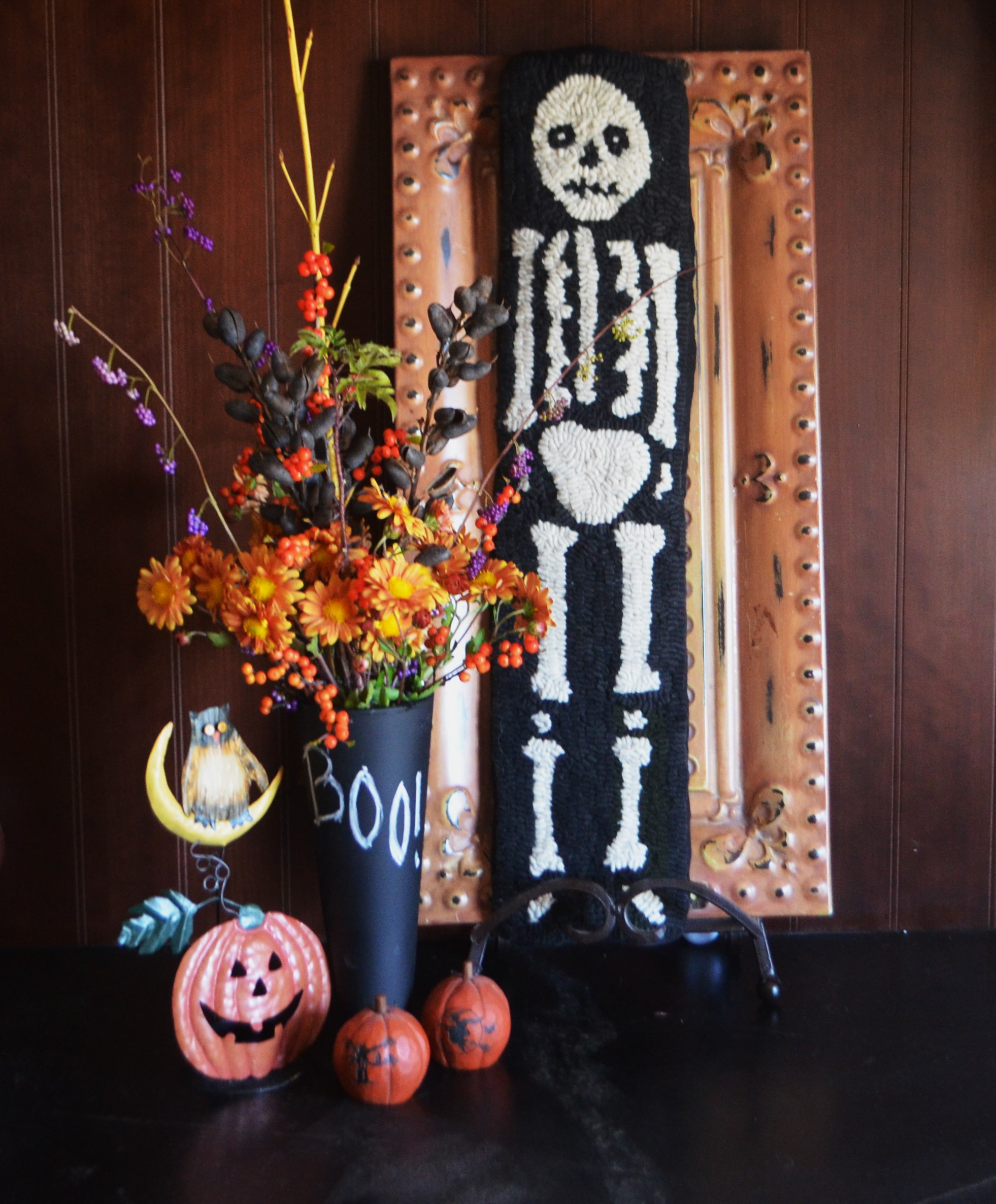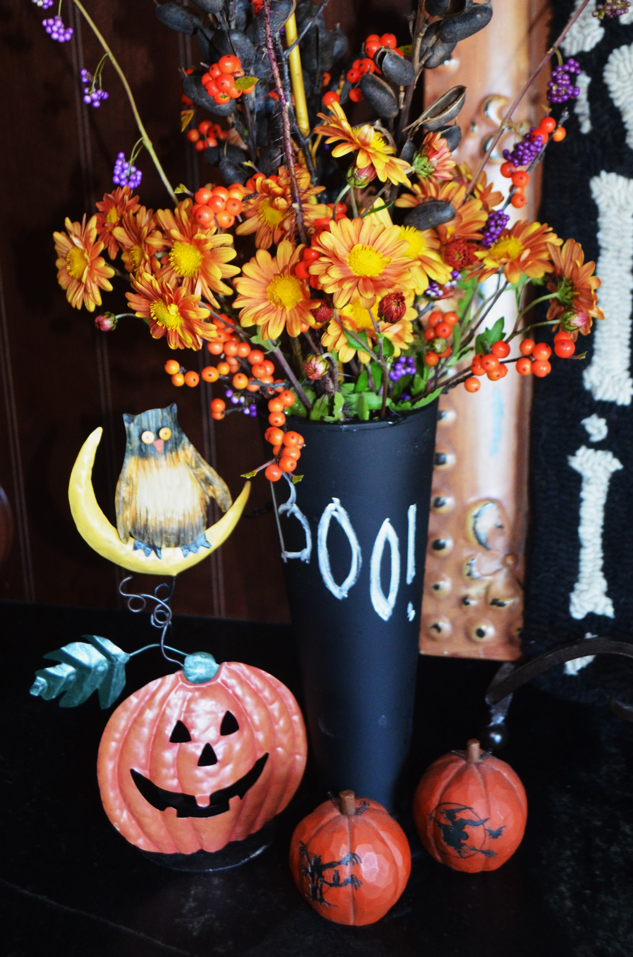 The last one is a kitschy piece of fun I duplicate in some format every October for my Halloween dessert table. this year I used a plastic tumbler from the dollar store that I spray painted it with chalkboard paint so I could write on it (BOO!) The berries are from the calliarpa dichotoma ‘Early Amethyst’, and Ilex verticellata ( a deciduous holly) ‘Winter Gold’, the pods are from baptisia australis or false indigo, toward the back there is a scary-spiny stem of solanum quitoense ( from seed I got from Nan Ondra at hayefield.com) in the center is a stem of yellow twig dogwood and the flowers are yet another Korean chrysanthemum called’Copper Penny’. I added some fluffy seed heads from clematis tanguitica ‘Bill McKenzie’ right when I was leaving to look ghost- like, but forgot to snap another photo.