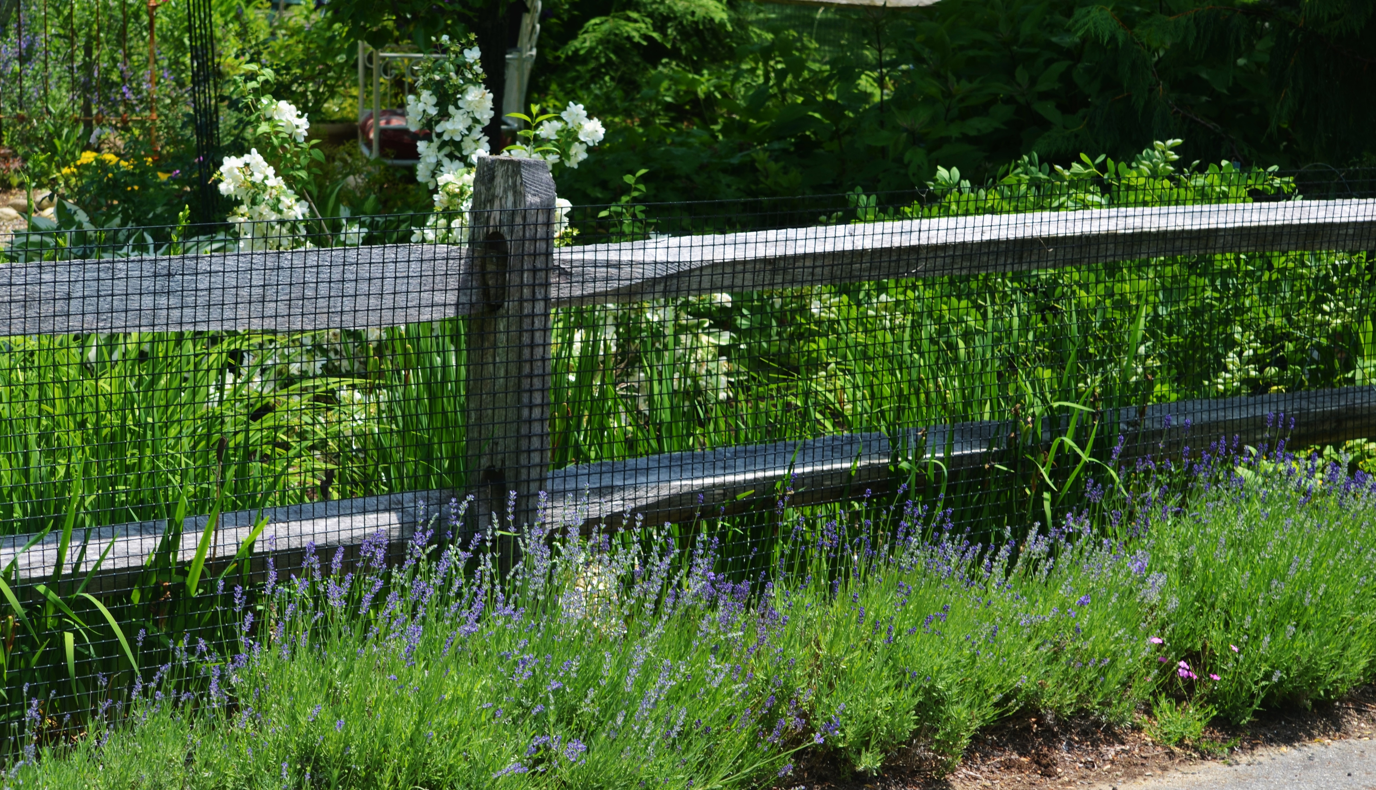 The third path to success is choosing the right lavender to begin with. There are over 30 species of lavender but the one I have had the most success with is lavandula angustifolia. There are many varieties of this species to choose from, but the bulk of my hedges are ‘the very floriferous’ Hidcote Blue ‘ and “Munstead’ ( both named after English gardens)., and I also grow a smaller shrub called ‘Lavenite Petite’ These original plants of these varieties have been happily living in my gardens for over 12 years, which is a long time for lavender to remain productive, but I never miss a pruning and the were planted right to begin with.Below you can see a part of the lavender hedge that lines the fence out front right after pruning., and below that what it looked like today.