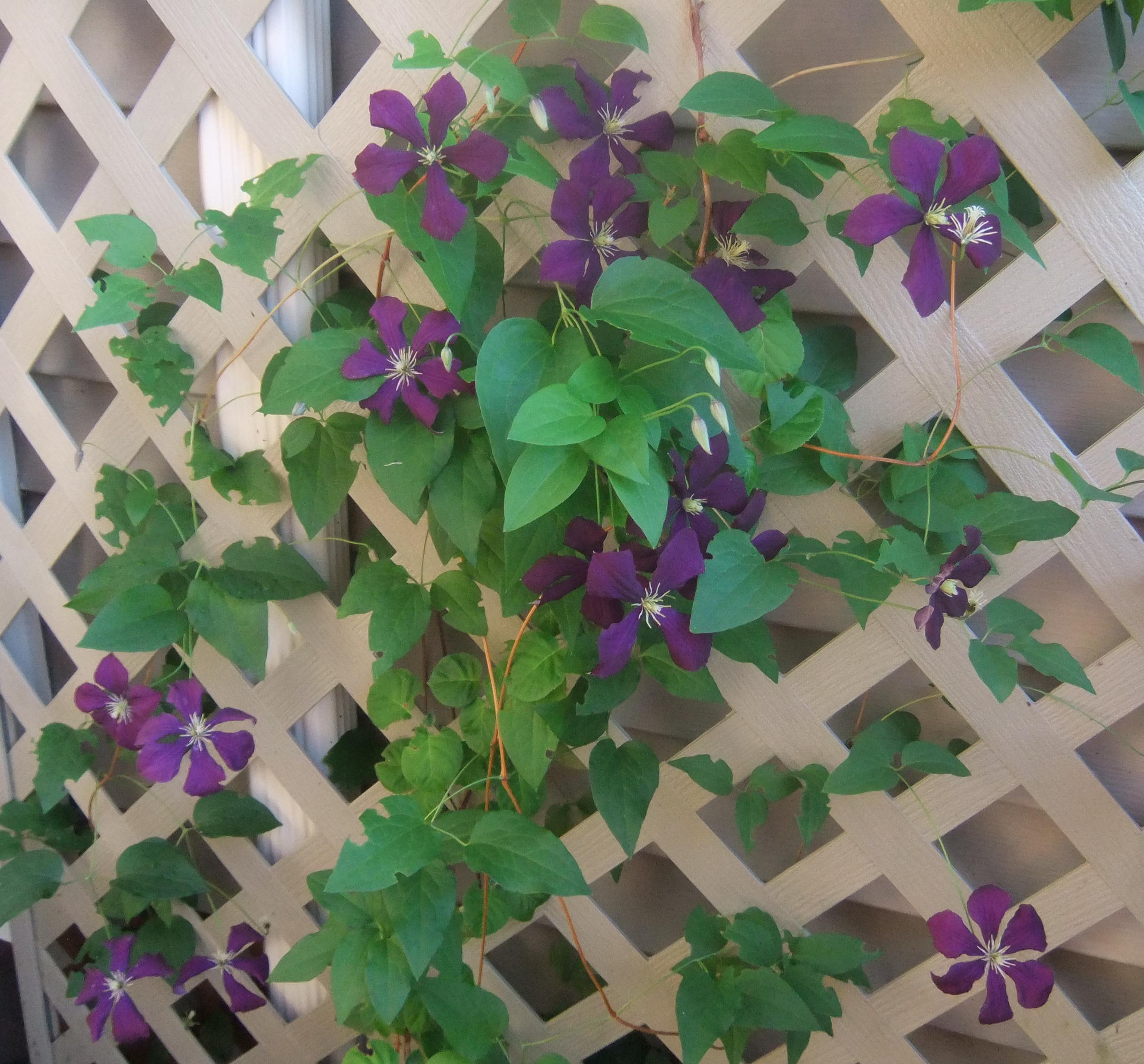 . It’s blooms are a very dark purple and shaped more like the saucers of the large flowered hybrids. Saying that c. vitacellas are easy to grow may seem to imply that othe clematis cultivars are difficult, but nothing could be further from the truth. In a nutshell if planted deeply with the crown of the plant AT LEAST 2-3 inches below the soil line, watered regularly ( 1 inch of rain a week or supplement when dry), and pruned according to how the individual plant blooms (more on that later) the are carefree easy perennial vines.